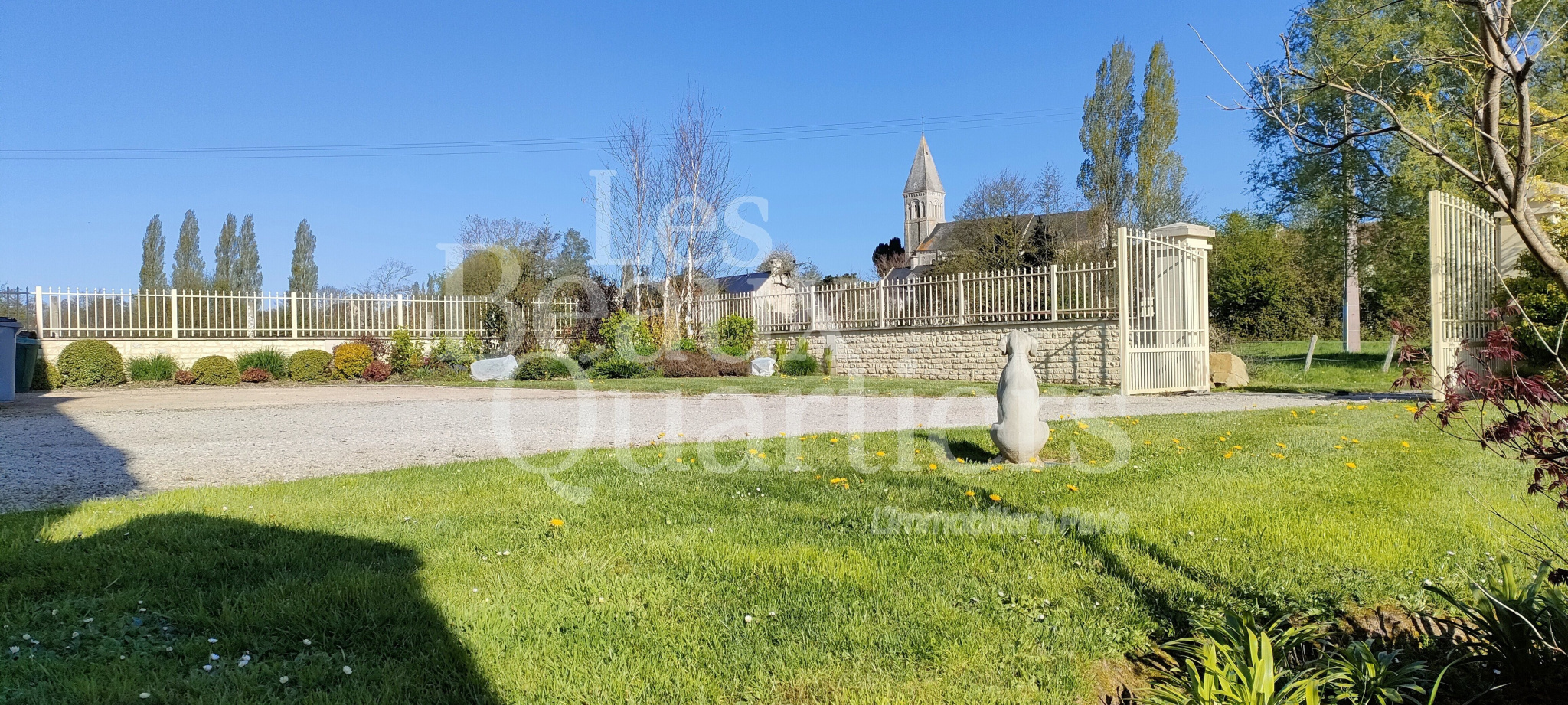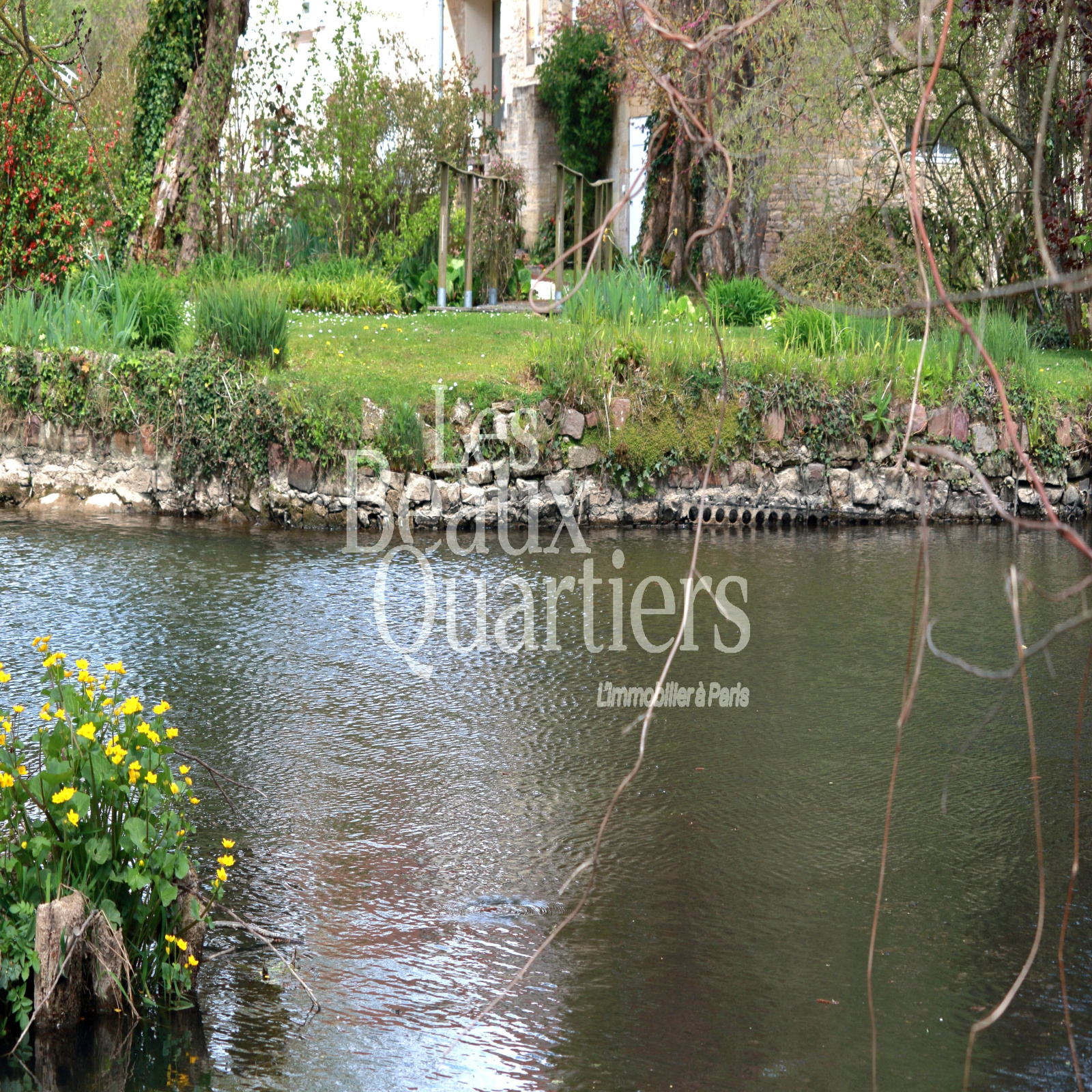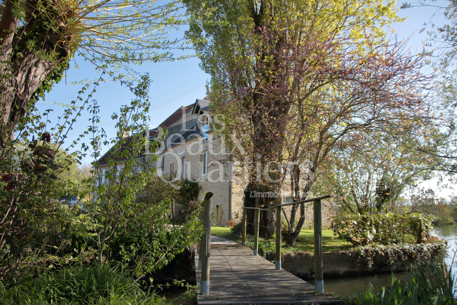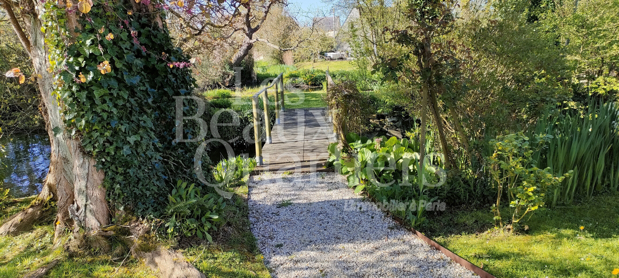 La propriété, sur environ 3 hectares, offre une cour, un jardin, et même un îlot accessible au moyen d'une passerelle, et une jolie prairie en bord de rivière.