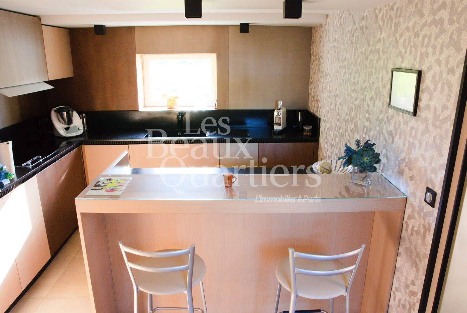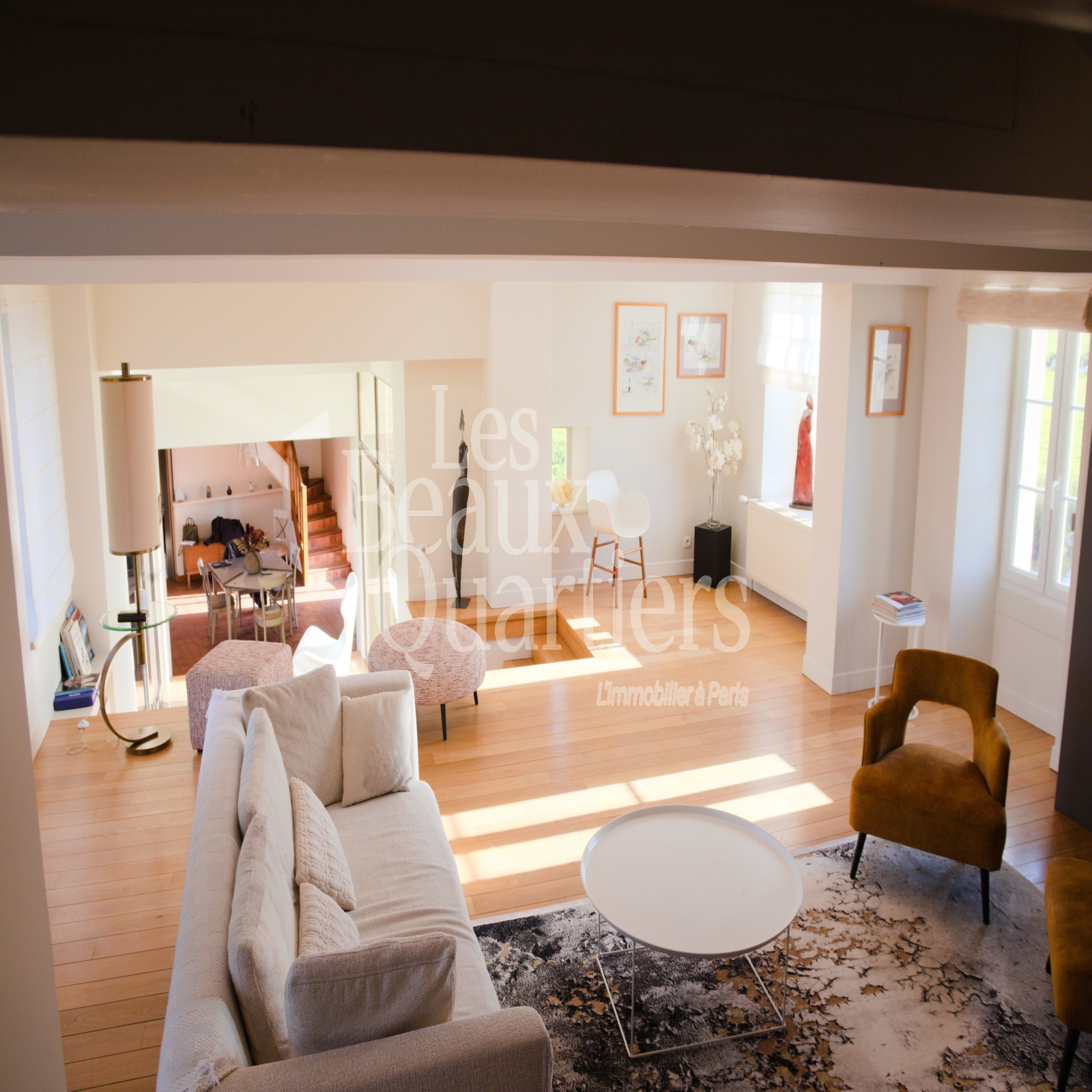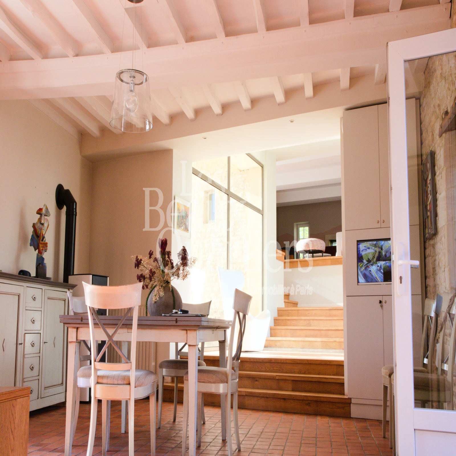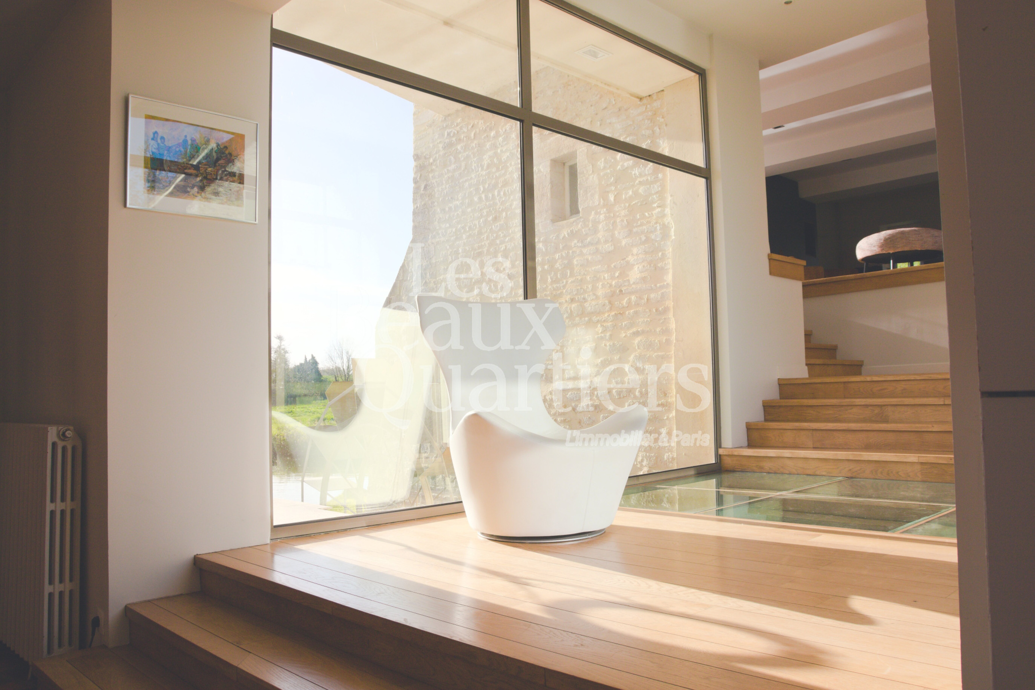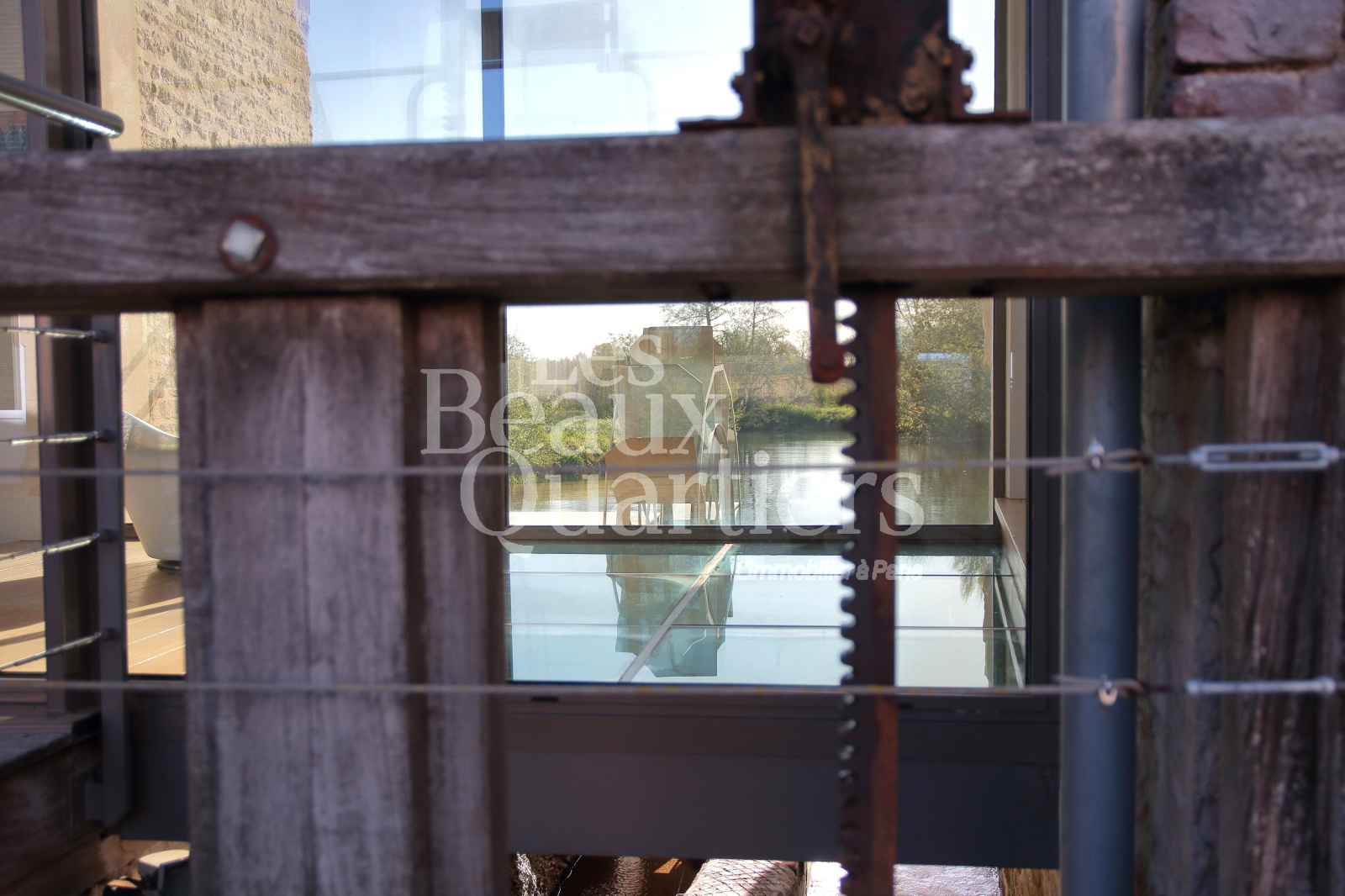Les volumes, demi-niveaux, le choix des matériaux, les jeux de lumière sur l'eau et dans le moulin créent une athmosphère pleine de chaleur et d'harmonie.