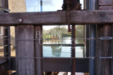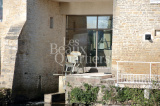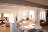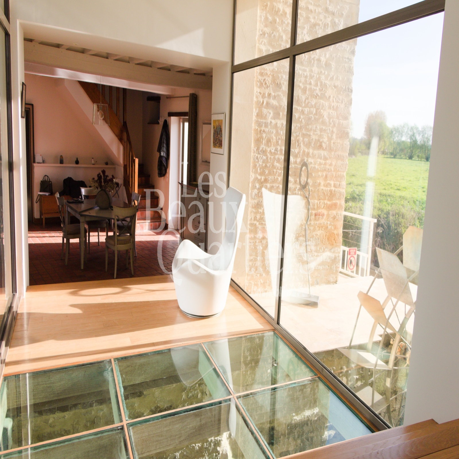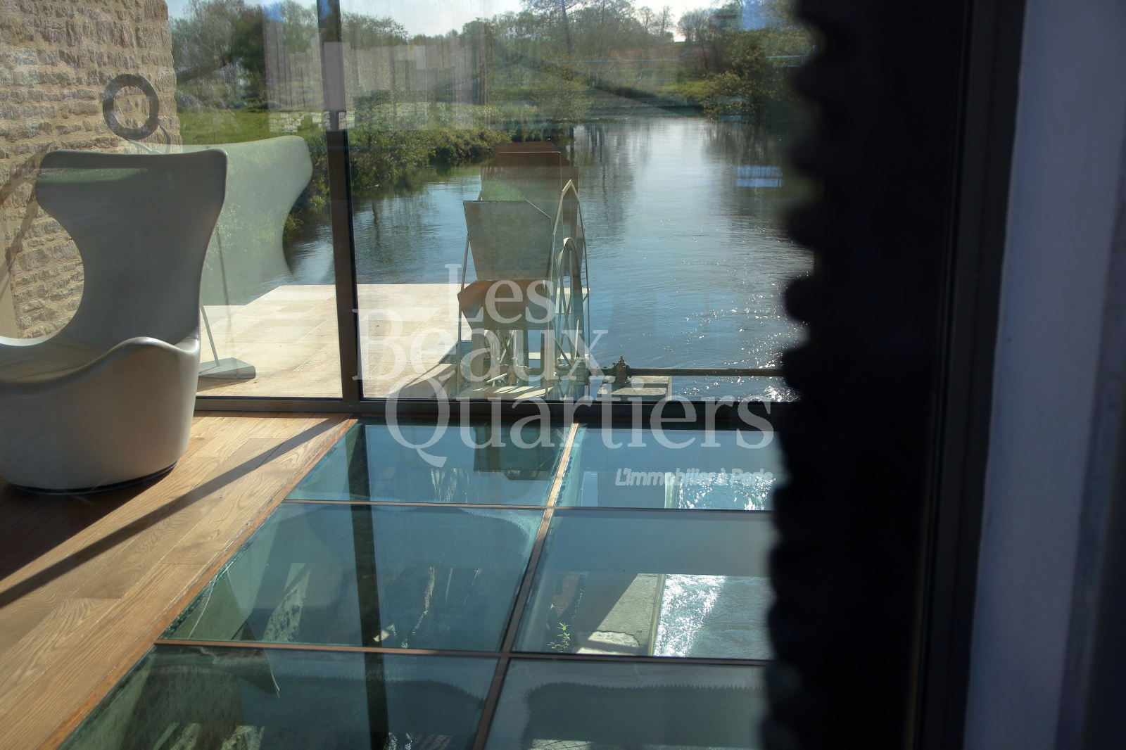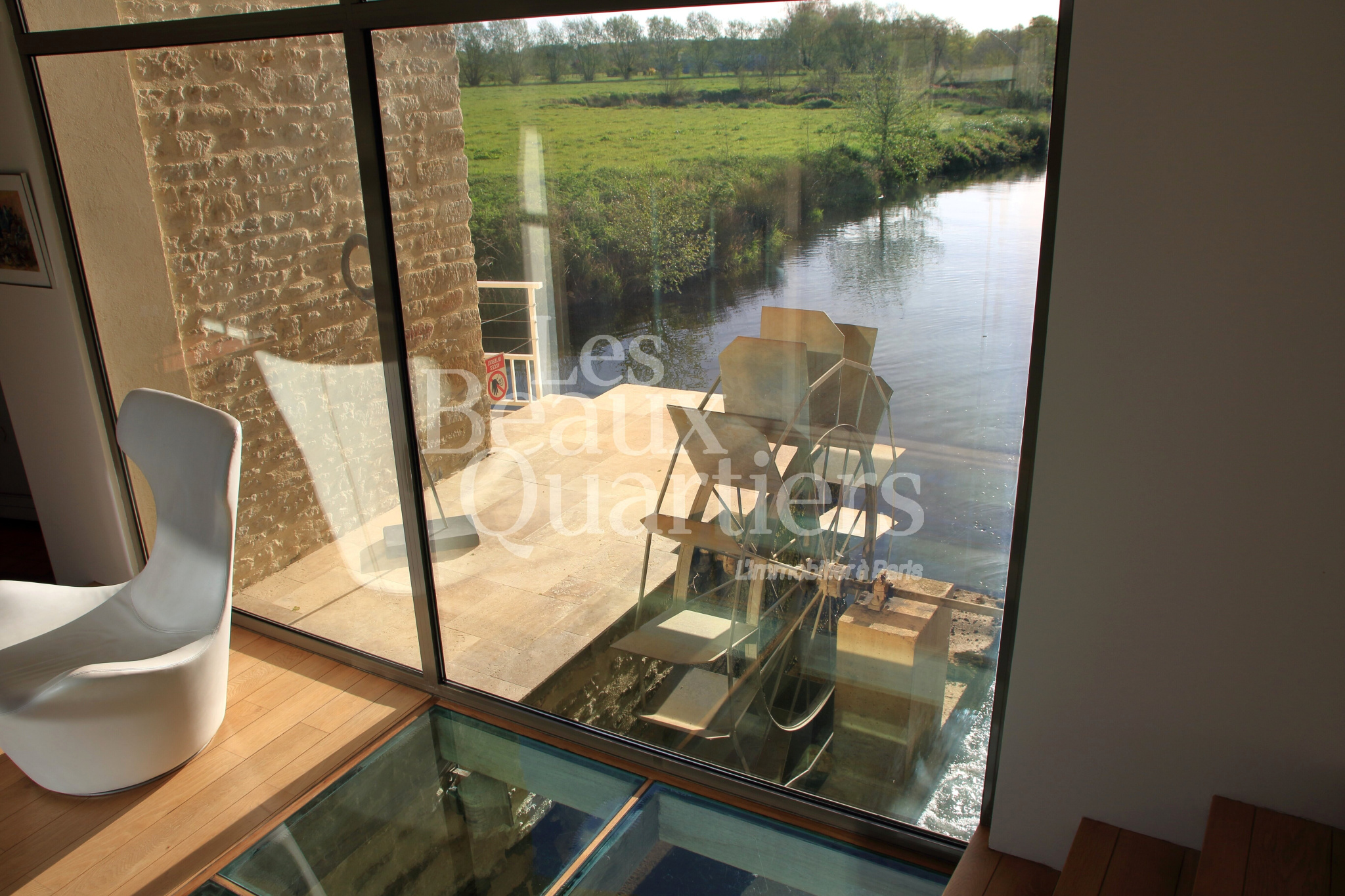 Le bâtiment principal, d'une surface habitable de 215 m2, offre au rez de chaussée un spectaculaire passage vitré, au sol fait de dalles de verre au dessus du bief, une cuisine équipée et une salle à manger ouvrant sur la rivière, un salon d’angle sur le jardin. A l'étage, quatre chambres dont une suite.