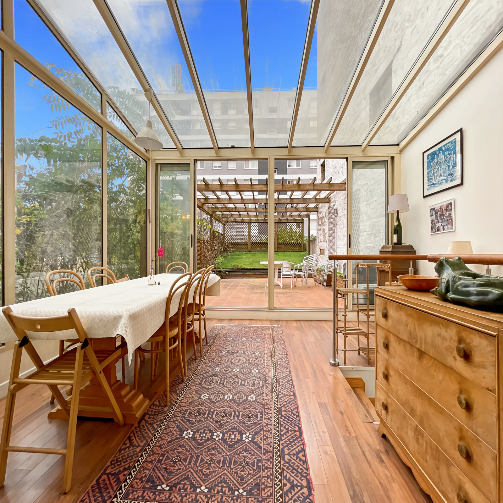 Elle se compose, sur 3 niveaux, d'un salon, d'une véranda chauffée faisant office de salle à manger, d'une cuisine dinatoire, de 5 chambres, d'un bureau et d'un atelier d'artiste. Une vaste terrasse (45 m²), un jardin (80 m²) et une cour (40 m²) vous permettront de profiter du grand air.