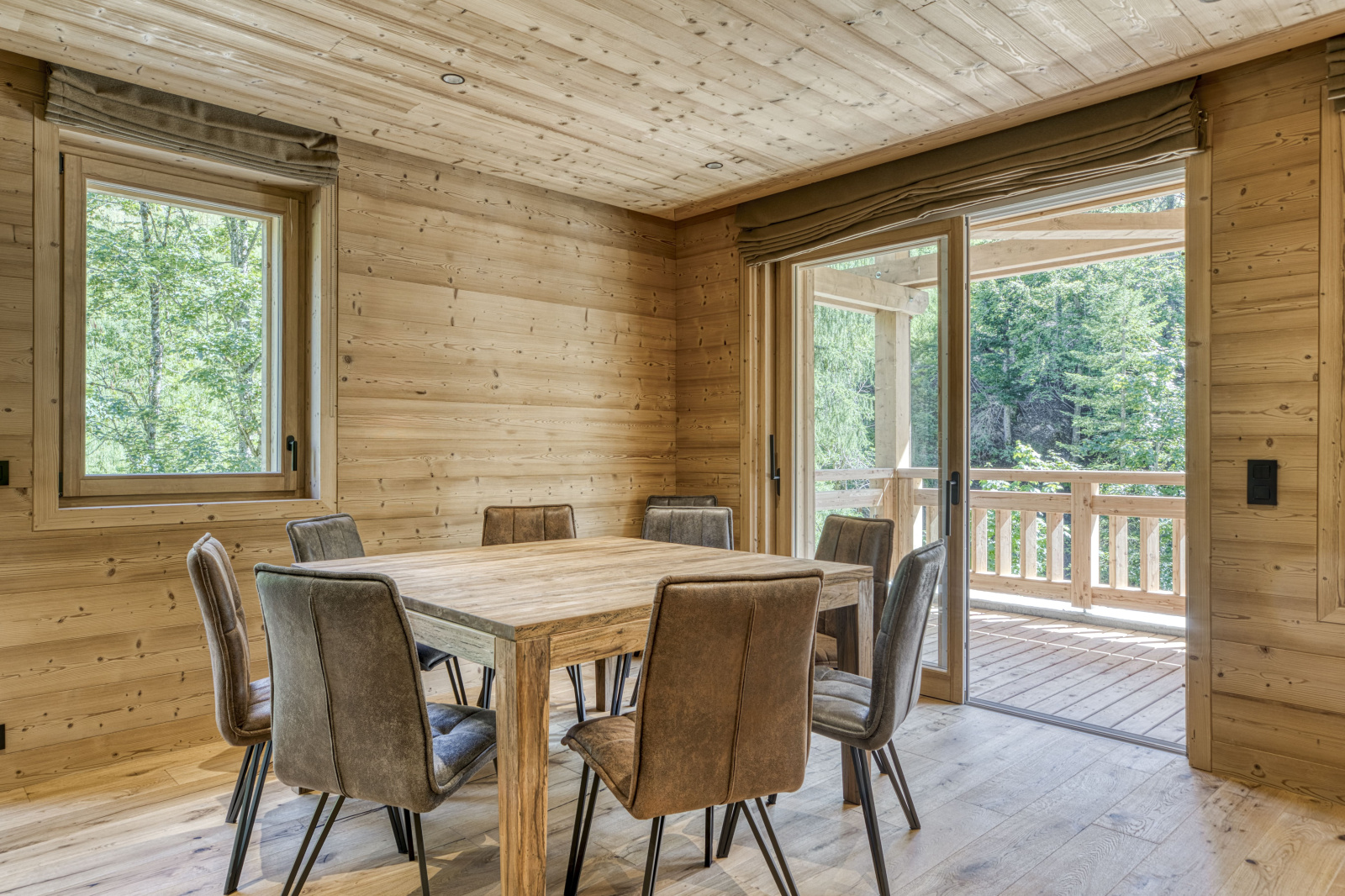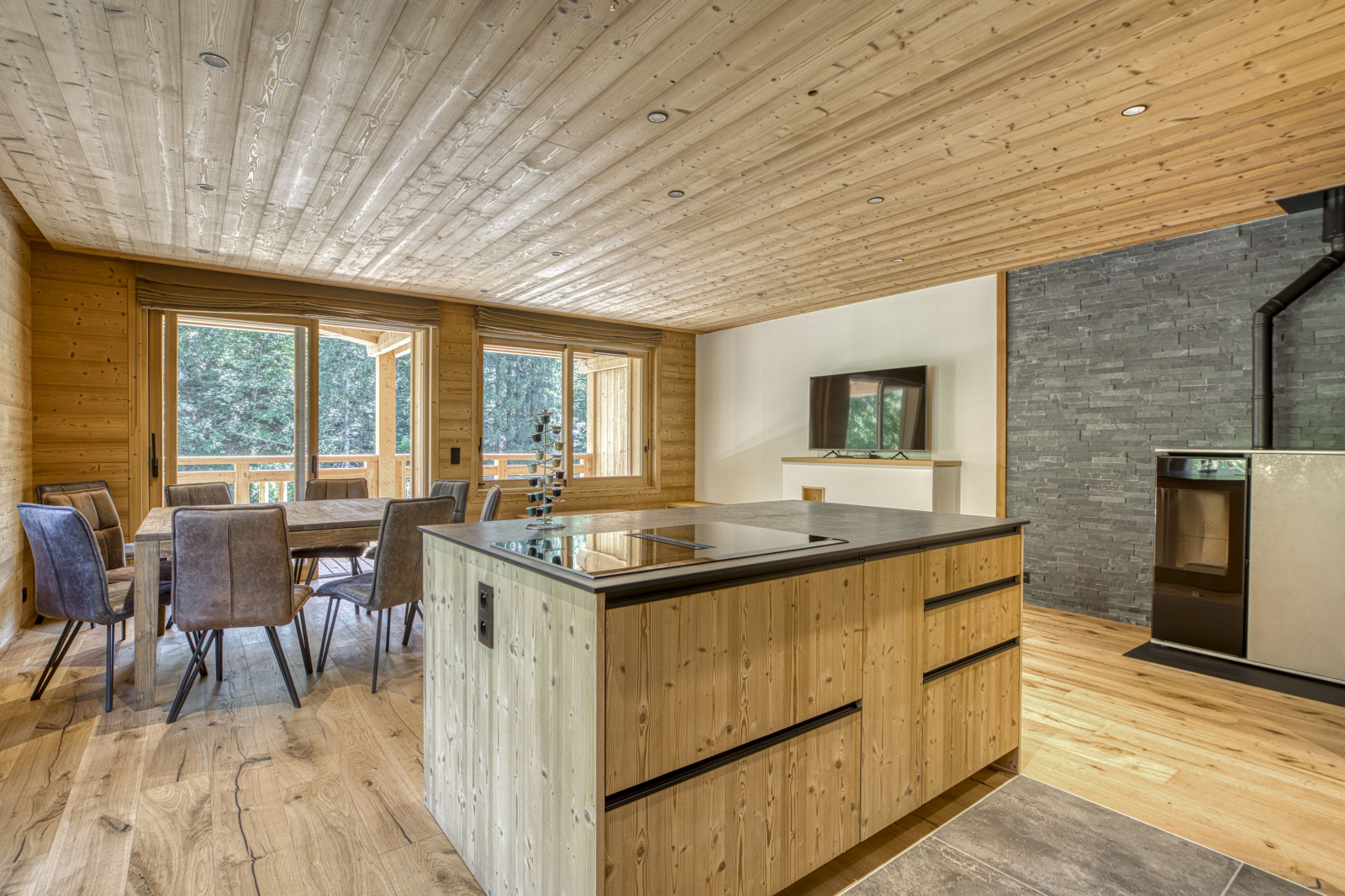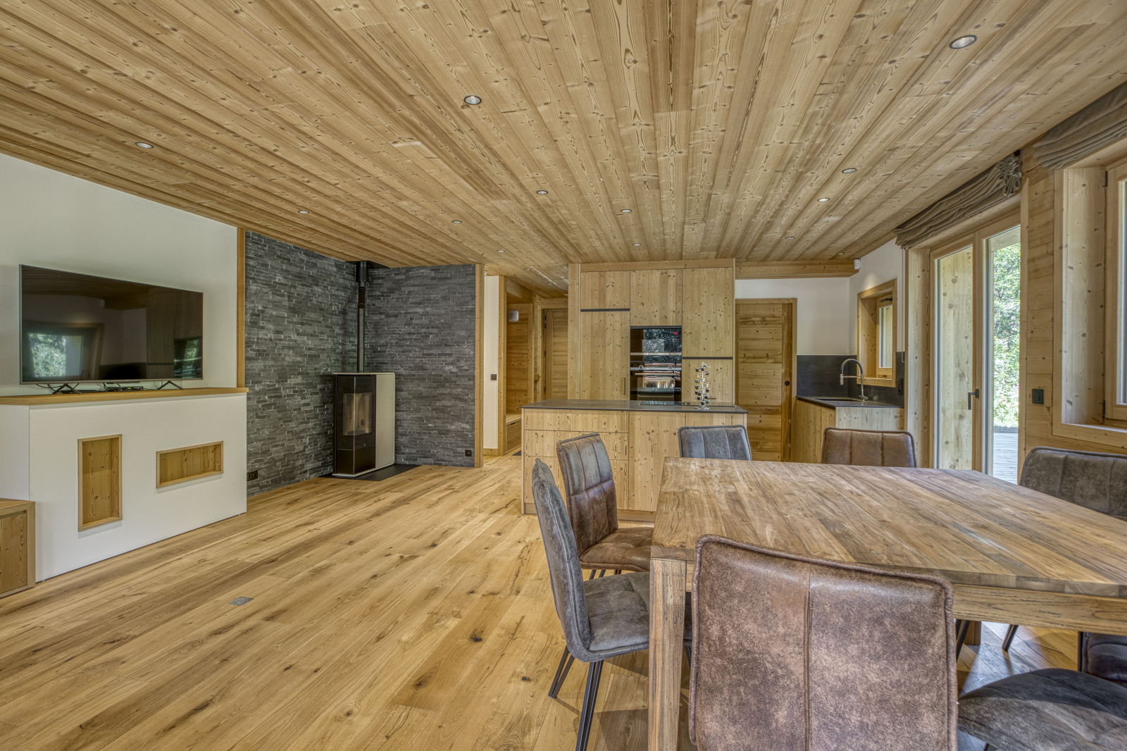 L’espace de vie se prolonge par 2 larges terrasses avec vue sur les montagnes et un ensoleillement optimal jusqu’au soleil couchant.